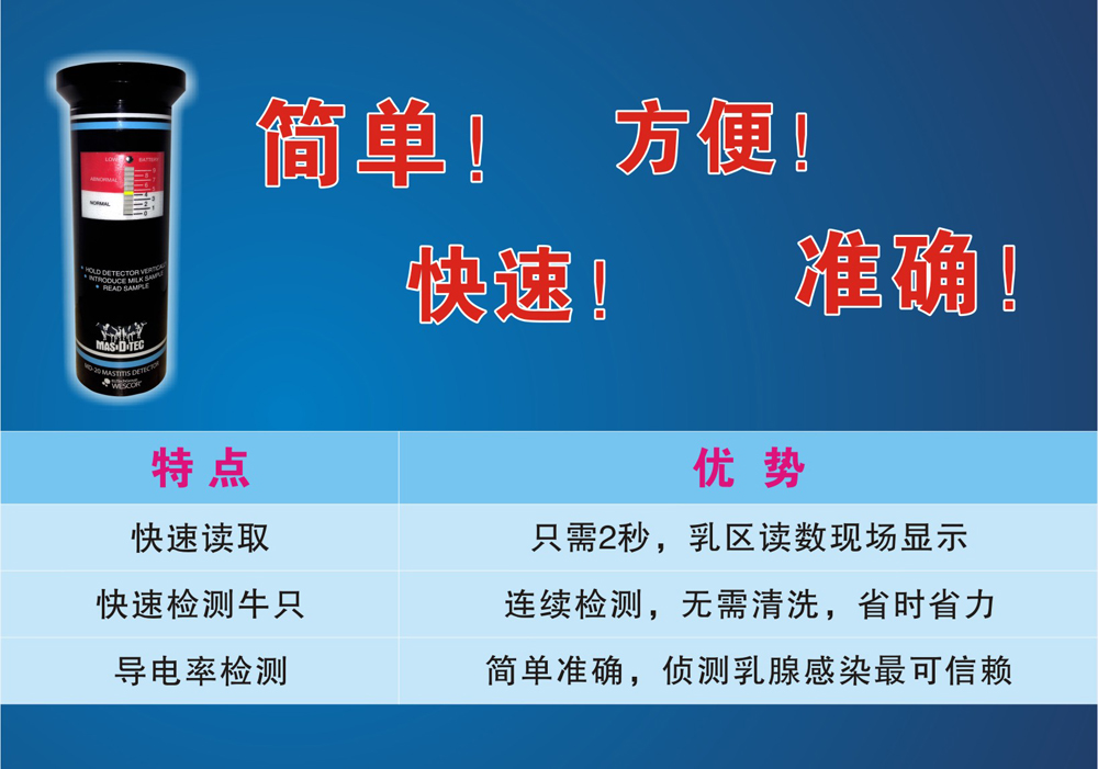 隱性乳腺炎檢測儀的探頭可探測和分析牛奶中電阻的瞬間變化。牛奶質量的高低不會影響試驗結果,但有乳腺炎的牛奶會影響試驗結果。只要簡單地把奶擠到測量杯中,按動開關和讀取數值即可。即使燈光條件不好,大數碼顯示也可很容易的讀出結果。