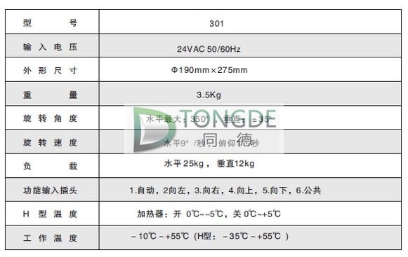 - 產品簡介: PTS-301,PTS-303室外全方位云臺選用永磁同步電機.水平自動限位調節,鋁合金材料,模壓鑄造成型,耐高溫,耐老化,抗腐蝕,抗強風,防水防酸雨. H型內置自動加熱系統,適用于高寒冷地區,云臺內可內置解碼器.TC-PTS-301,TC-PTS-303室外全方位云臺均可裝雙側紅外射燈成為紅外夜視系統.
